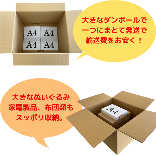 通常サイズの箱では入りにくい荷物もまとめて梱包可能です。