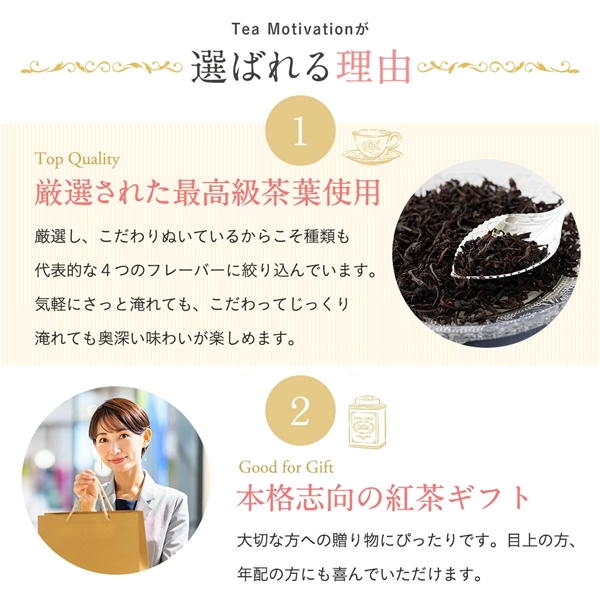 選りすぐりの4種類の紅茶ティーバッグがセットになっており、それぞれ異なる風味と香りをお楽しみいただけます。