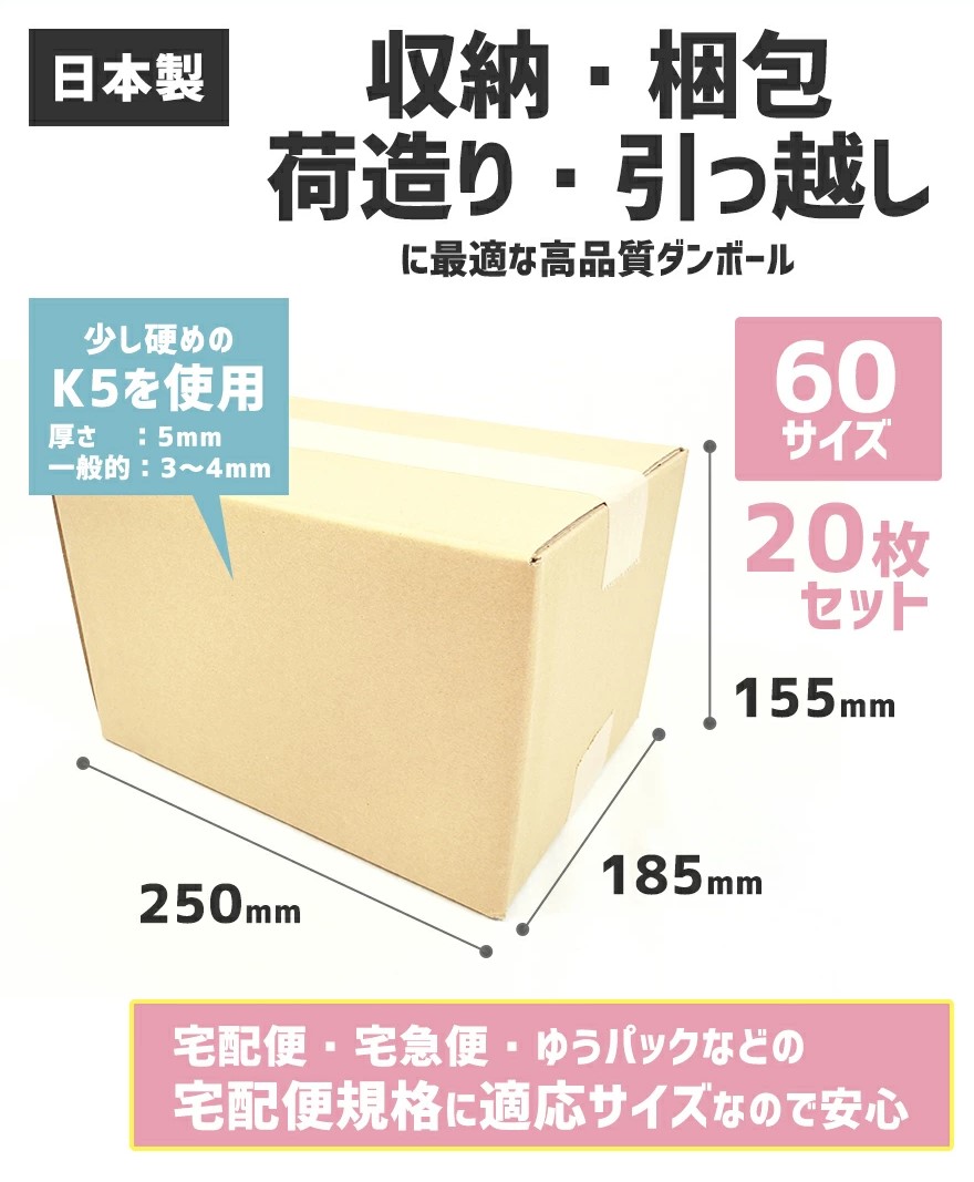 梱包や宅配等に使いやすい、宅配便60サイズ対応の段ボールです。