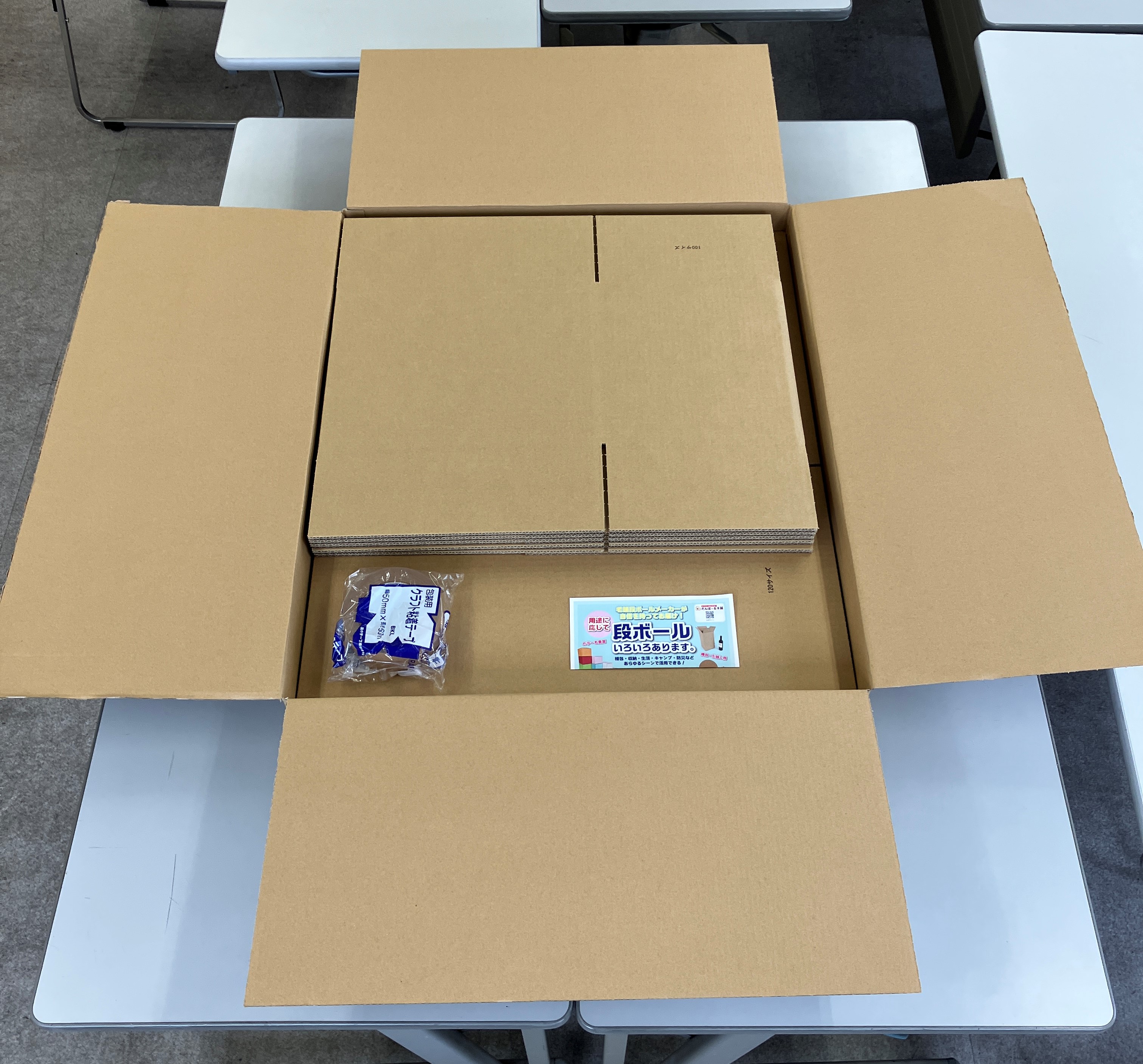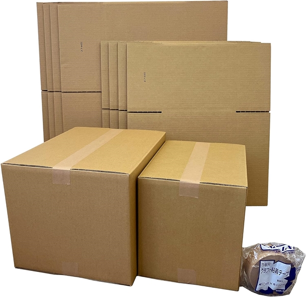- 荷物梱包用のダンボール100サイズが5枚・120サイズが5枚と、クラフトテープが1巻付いたお得なセットです。