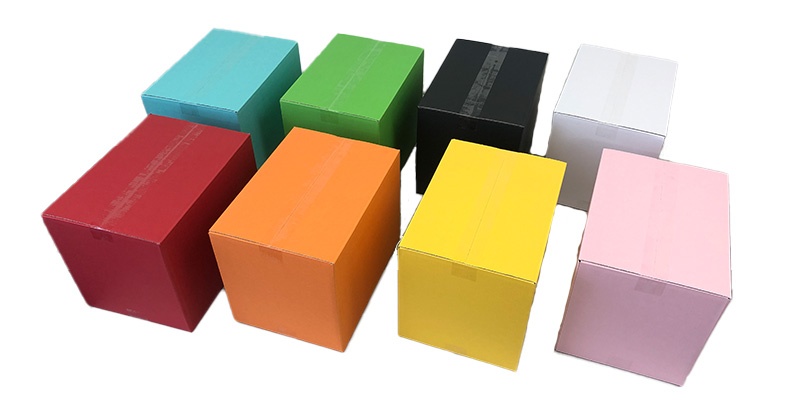 100サイズのカラーダンボールは「赤・ピンク・黄・オレンジ・黄緑・水色・黒・白」の合計8色で展開。