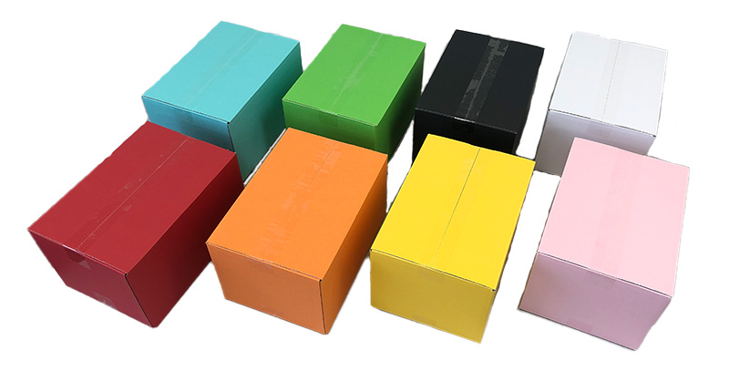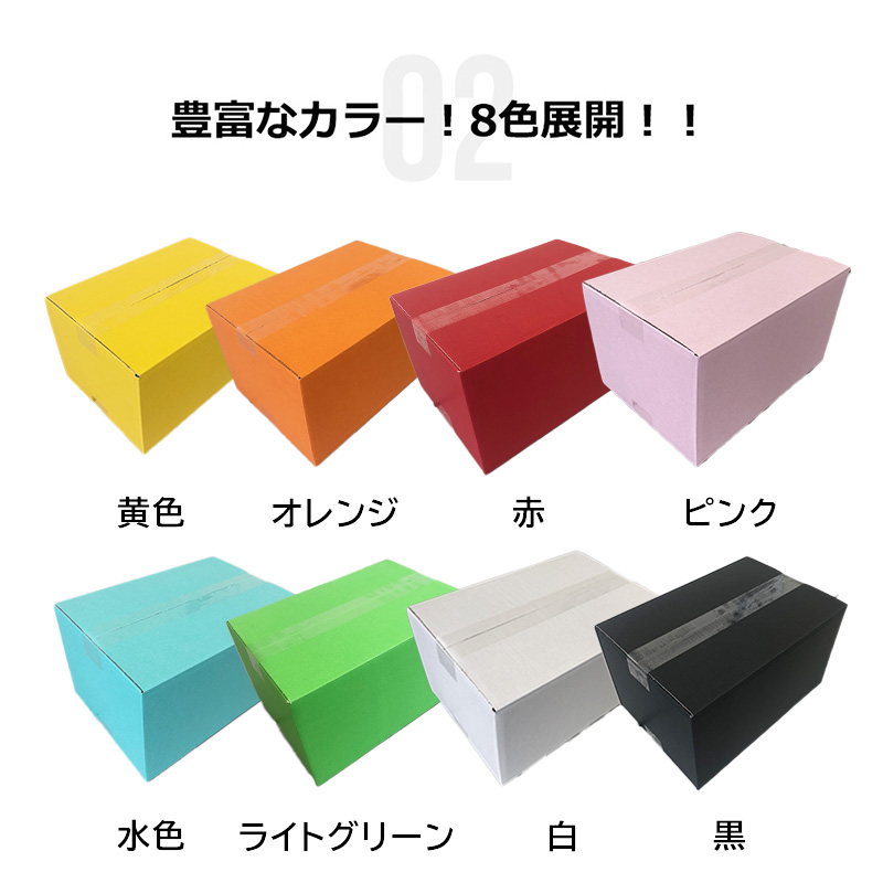 80サイズのカラーダンボールは「赤・ピンク・黄・オレンジ・緑・水色・黒・白」の合計8色で展開。