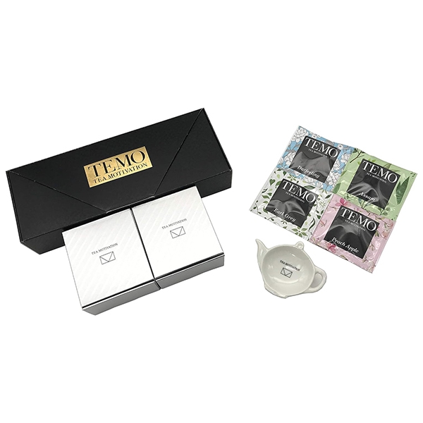 スペシャルデザインのパッケージと個包装ティーバッグを、外箱は黑に金の箔押しで