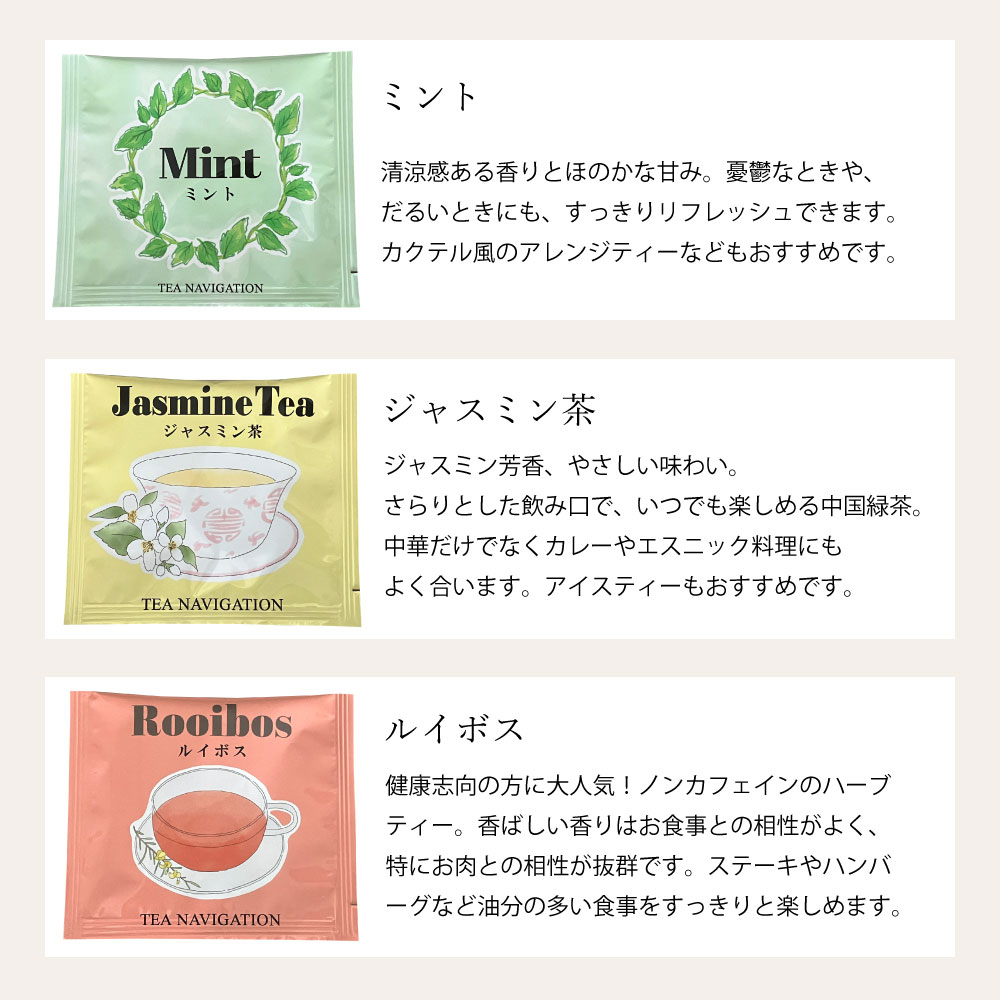 TEA NAVIGATIONの22種類のフレーバーを1包ずつ詰め込みました。