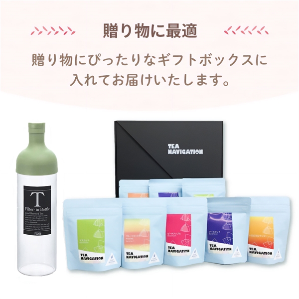 人気のキングスセットに(水出しアールグレイ×2、水出しマスカット×2、水出しアプリコット、水出しピーチアップル、水出しフルーツミックス、水出しトロピカルマンゴー)人気のHARIO750ml フィルターインボトルをセットに致しました。