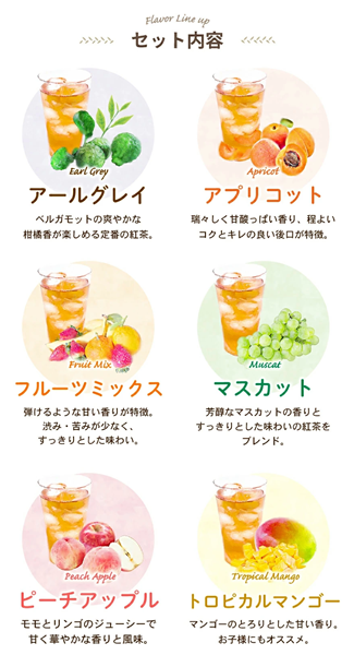 人気のキングスセットに(水出しアールグレイ×2、水出しマスカット×2、水出しアプリコット、水出しピーチアップル、水出しフルーツミックス、水出しトロピカルマンゴー)人気のHARIO750ml フィルターインボトルをセットに致しました。