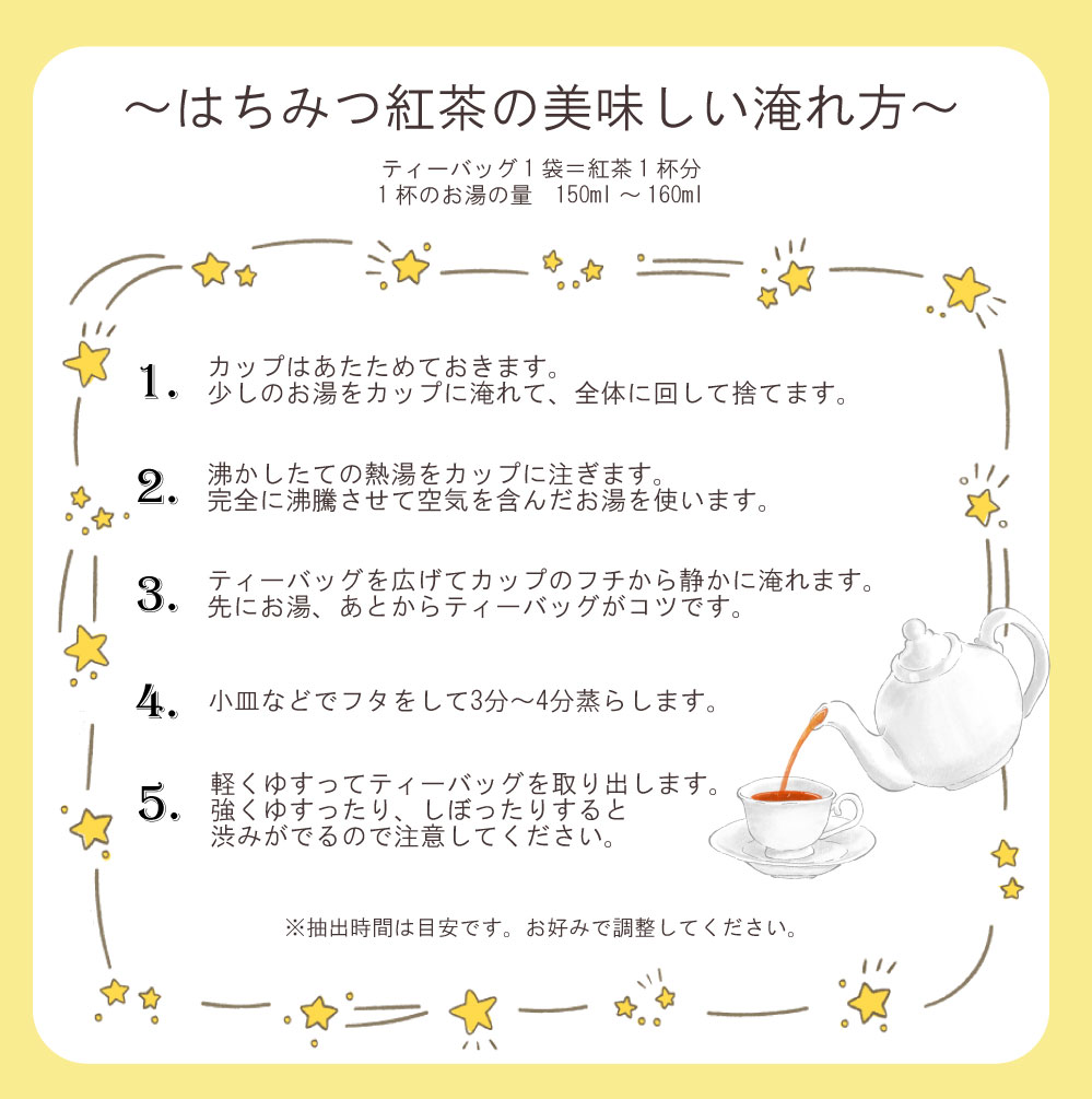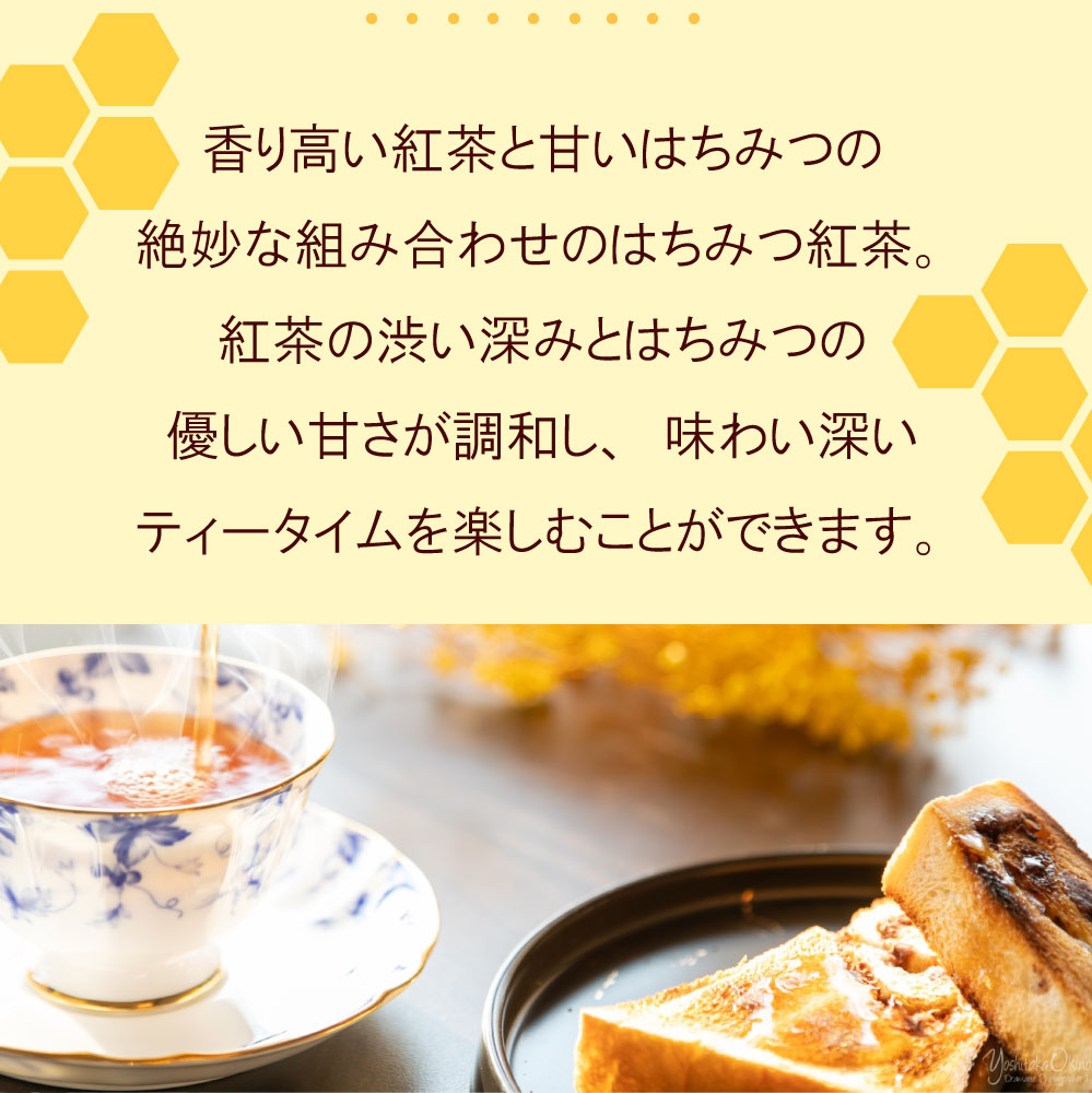 紅茶の渋い深みとはちみつの優しい甘さが調和し、味わい深いティータイムを楽しむことができます。